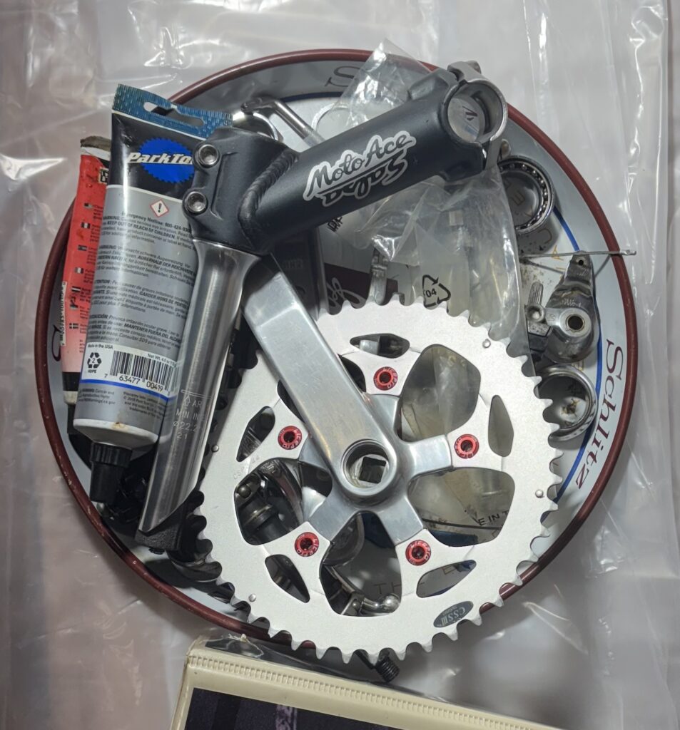 The Mesa Runner was originally designed and marketed as a comfort bike. No matter the lower end components as they mostly ended up in the garbage can. I bought this bike because of the frame and the rear drops. The top mount Shimano shifters were cleaned and will be kept. The plan is to utilize an old, mismatched wheelset that I cobbled together for my first mountain bike back in the early 90s. I “found” these wheels sitting on the floor under my workbench. Suntour XC Pro Pedals with grease guard will be used. I think I paid $40 for these pedals 30 years ago. They were an upgrade from the stock pedals on my old DiamondBack Ascent EX. Shortly after upgrading I switched to clipless so these pedals went into storage pretty early on. They are in great shape. These pedals regularly sell for $125-150 on eBay. I guess the point is, there will be some nice trinkets on this new build. I’m thinking of spending some cash on a really good crankset.