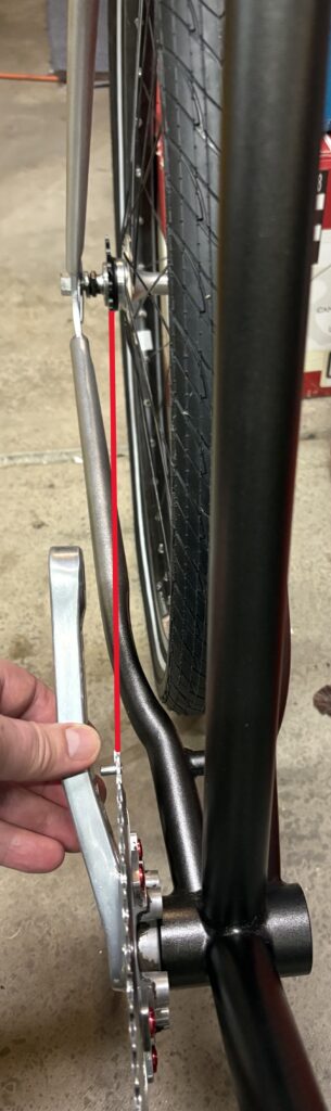 The rear wheel I want to use needs re-dished. And there is a spoke that needs fixed. These are all obstacles that can be addressed at the same time by the wheelsmith. You can see the existing chainline in the above photo. That wheel was originally set up with a cluster of gears. Now, there will be a single cog and lock ring. So that connection between the front ring and the rear cog needs to be a dead nut straight line.
